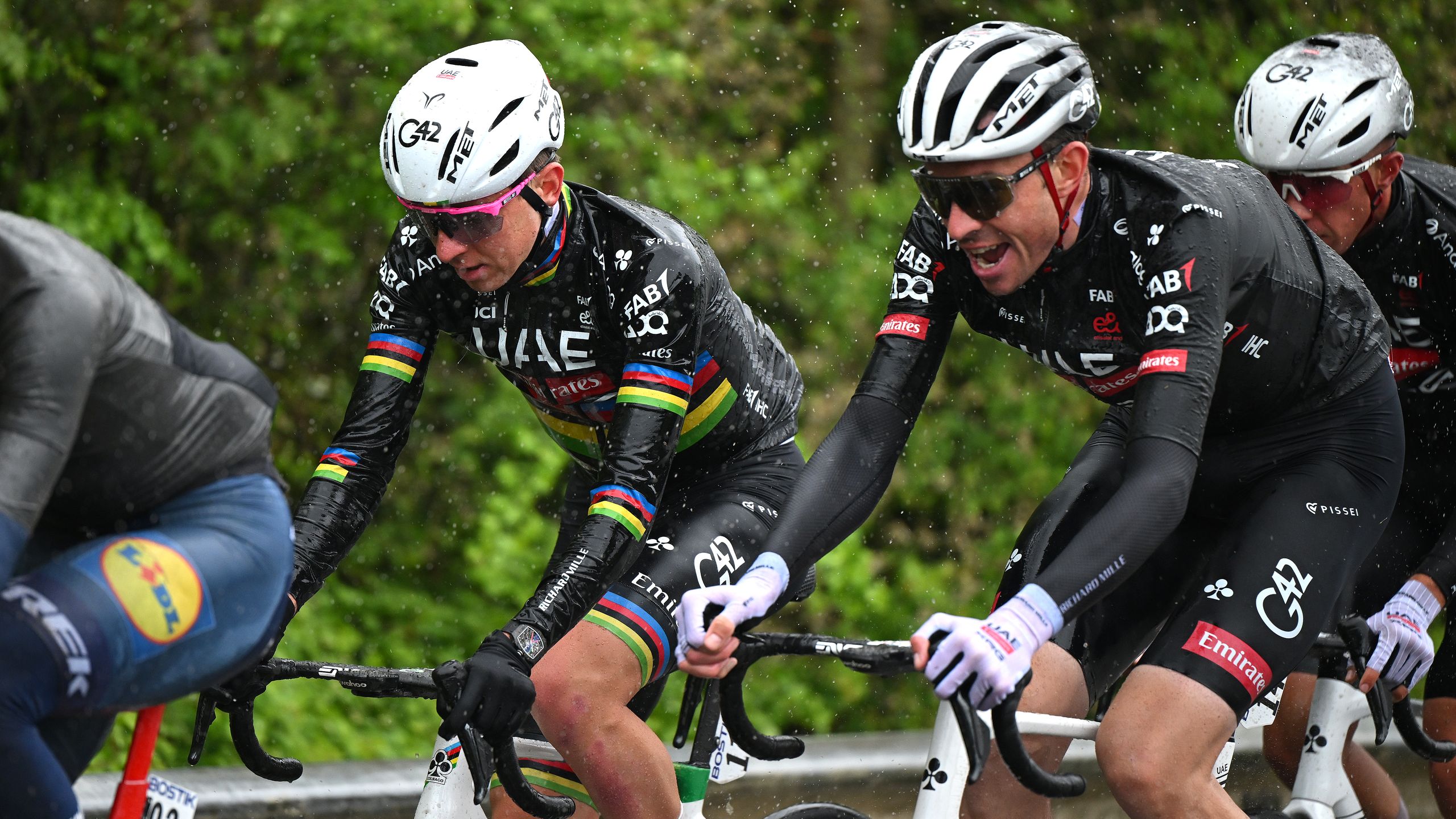 C'est parti pour la montée finale du Mur de Huy (1,3km à 9,6, max 22%) ! Les UAE-Emirates-XRG emènent très fort pour Pogacar dès le pied.