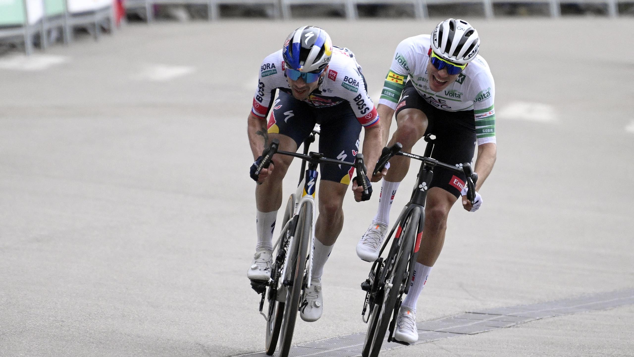 Attitude radicalement opposée pour les deux premiers du classement général : alors que Primoz Roglic (2e à 1'' d'Ayuso) ne cesse de discuter avec la direction de course pour disputer une course, le leader Juan Ayuso se désintéresse complètement de la situation et pointe à l'arrière du peloton.